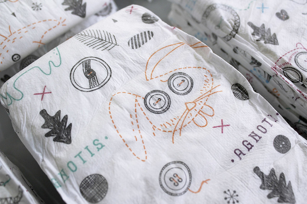 设计儿童纸尿裤突出洁净童趣的概念。新颖独特的运用手绘,设计出以扣子作为主体的一系列漫画形象。缔造出可爱又不乏时尚感的图案设计。